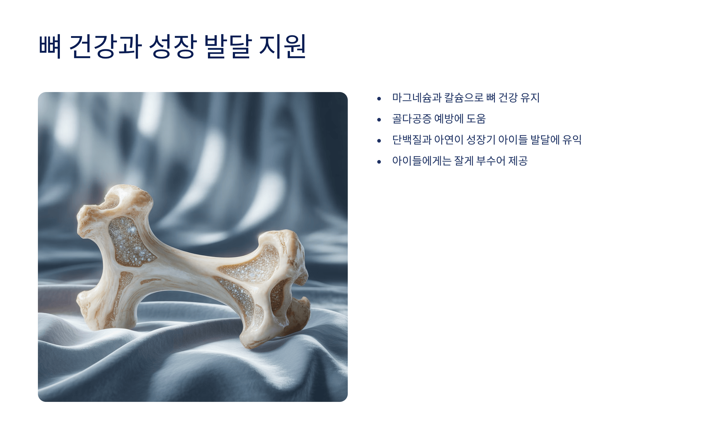 해바라기씨 속 마그네슘과 칼슘은 뼈 건강을 지켜주고 골다공증 예방에 도움이 됩니다. 또한 단백질과 아연이 성장기 아이들의 발달에도 유익해요. 다만 아이들에게는 잘게 부수거나 갈아서 먹이는 게 안전합니다. 🦴