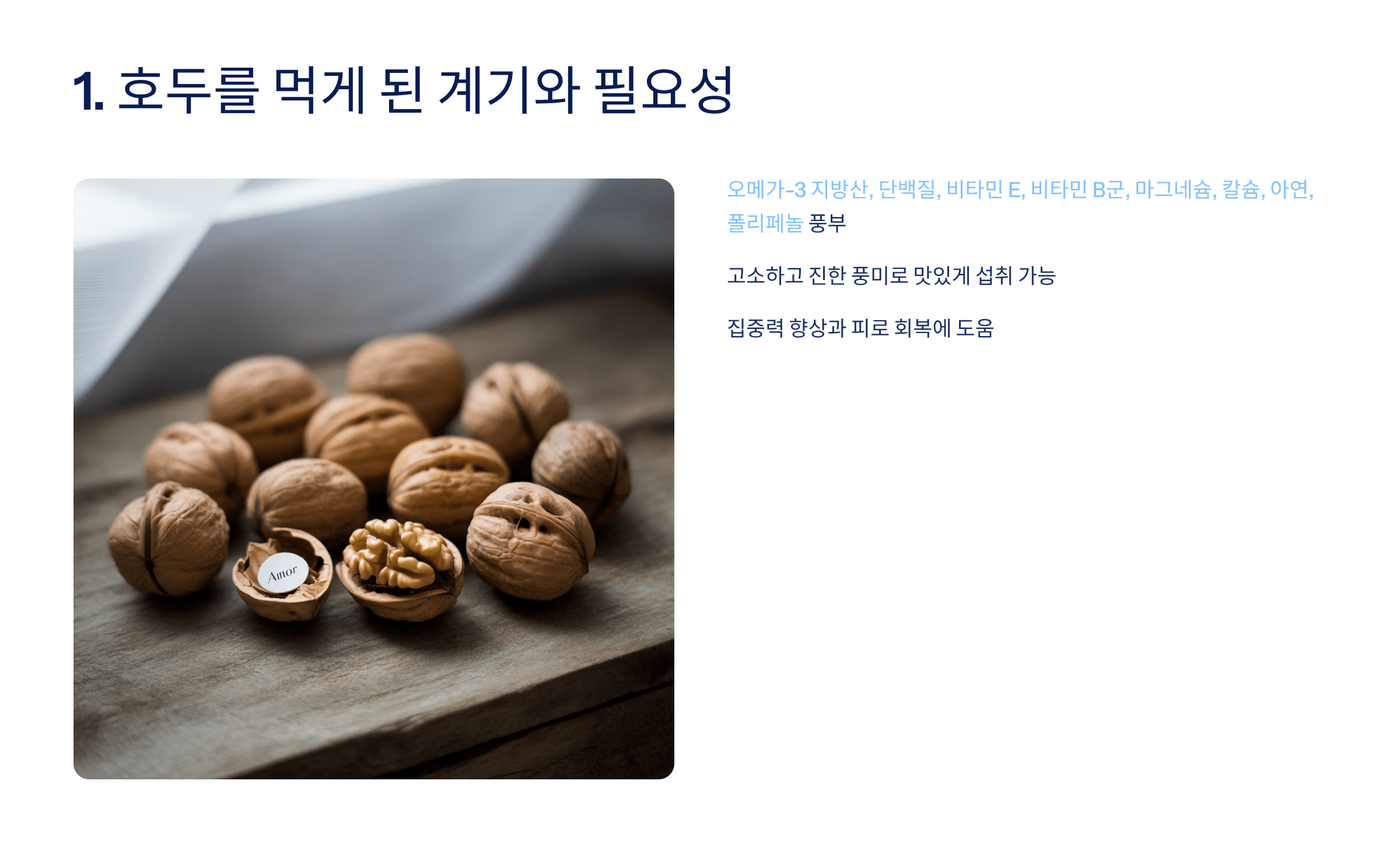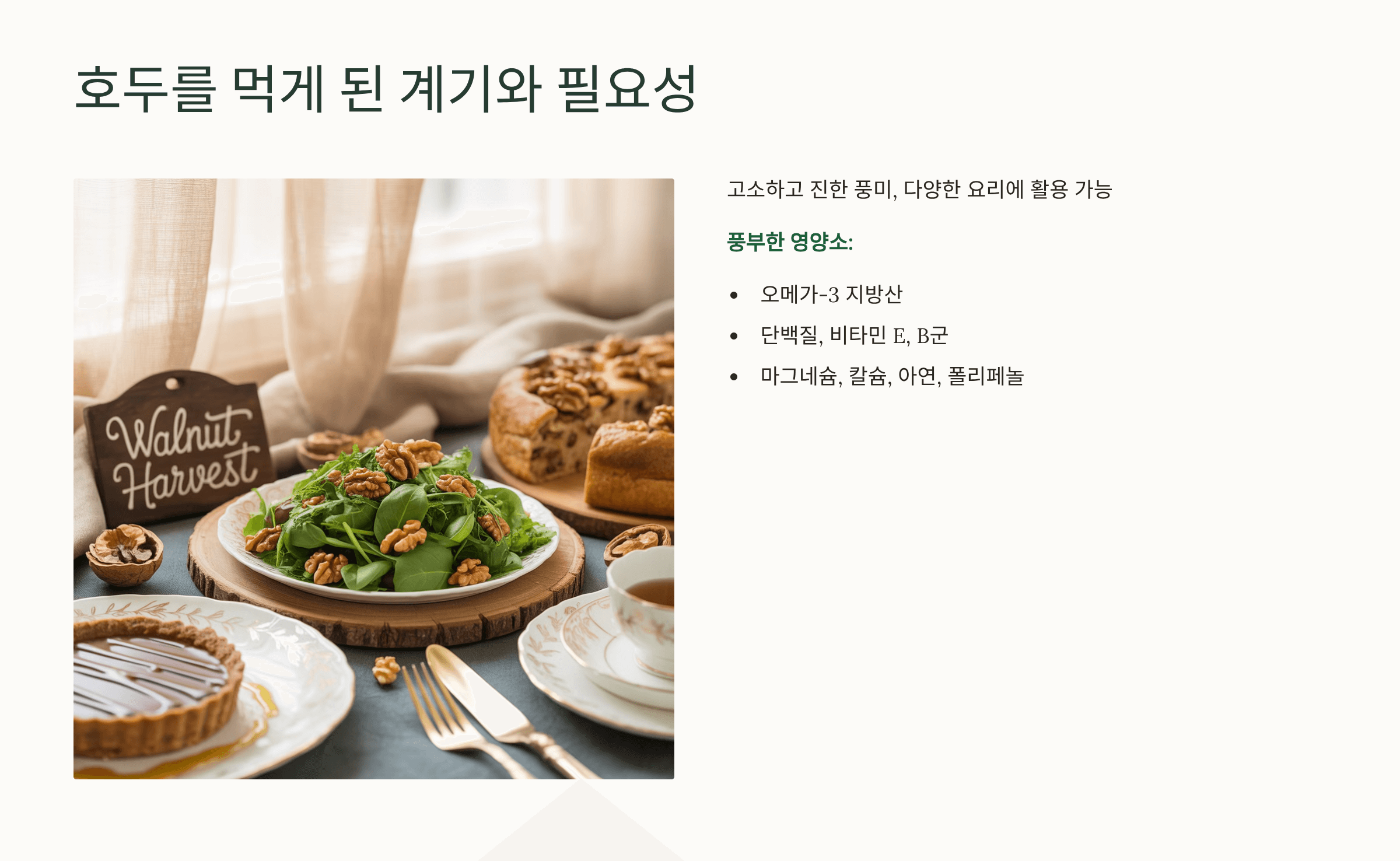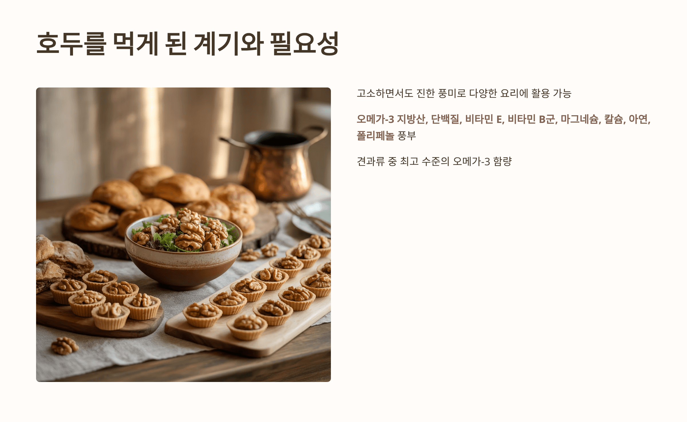 호두는 고소하면서도 진한 풍미가 있어 그냥 먹어도 맛있고, 샐러드나 빵, 요리에 활용해도 참 좋습니다. 처음에는 단순히 맛있어서 먹기 시작했는데, 알고 보니 영양학적으로도 매우 가치가 높은 식품이더라구요.