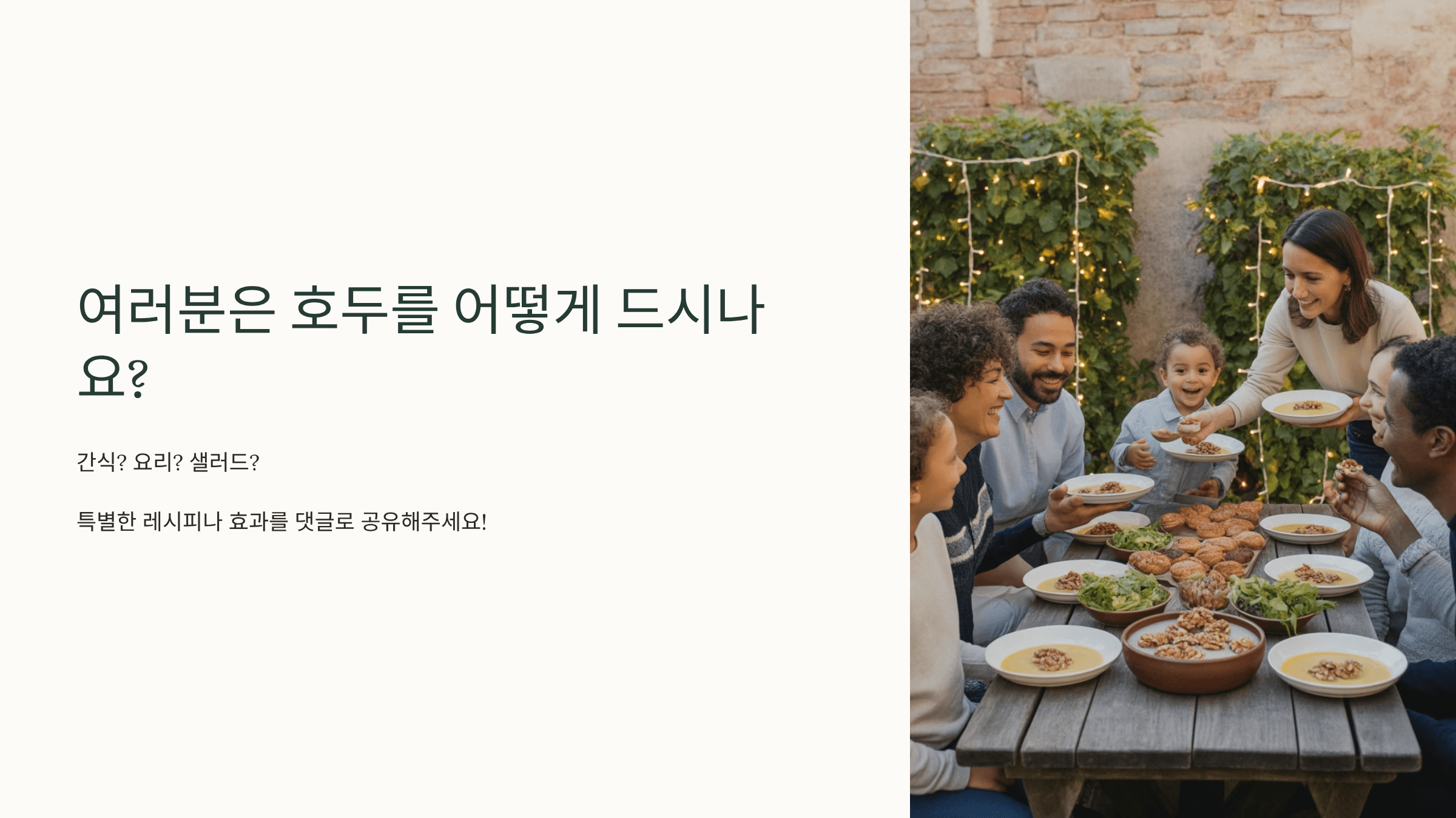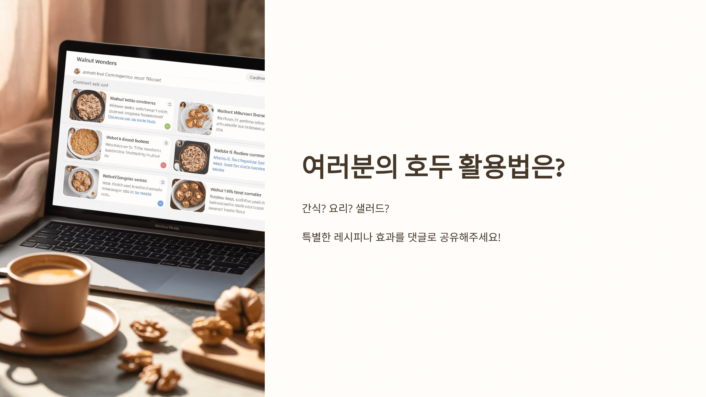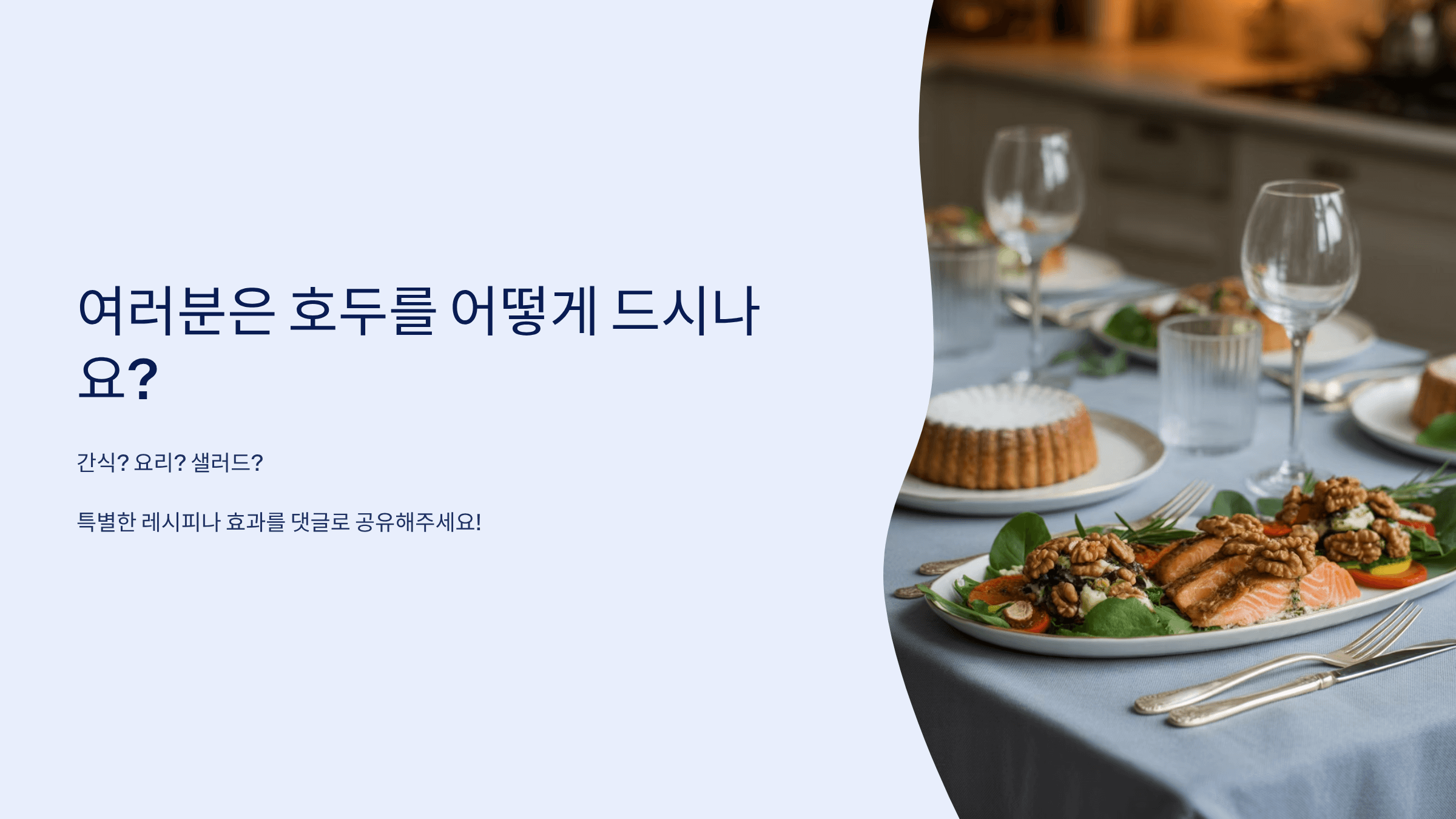 여러분은 호두를 어떻게 드시나요? 그냥 간식으로 즐기시나요, 아니면 요리에 활용하시나요? 저는 샐러드와 함께 먹는 걸 가장 좋아해요. 혹시 특별한 레시피나 호두 섭취로 체감한 효과가 있으시다면 댓글로 함께 나눠주세요!