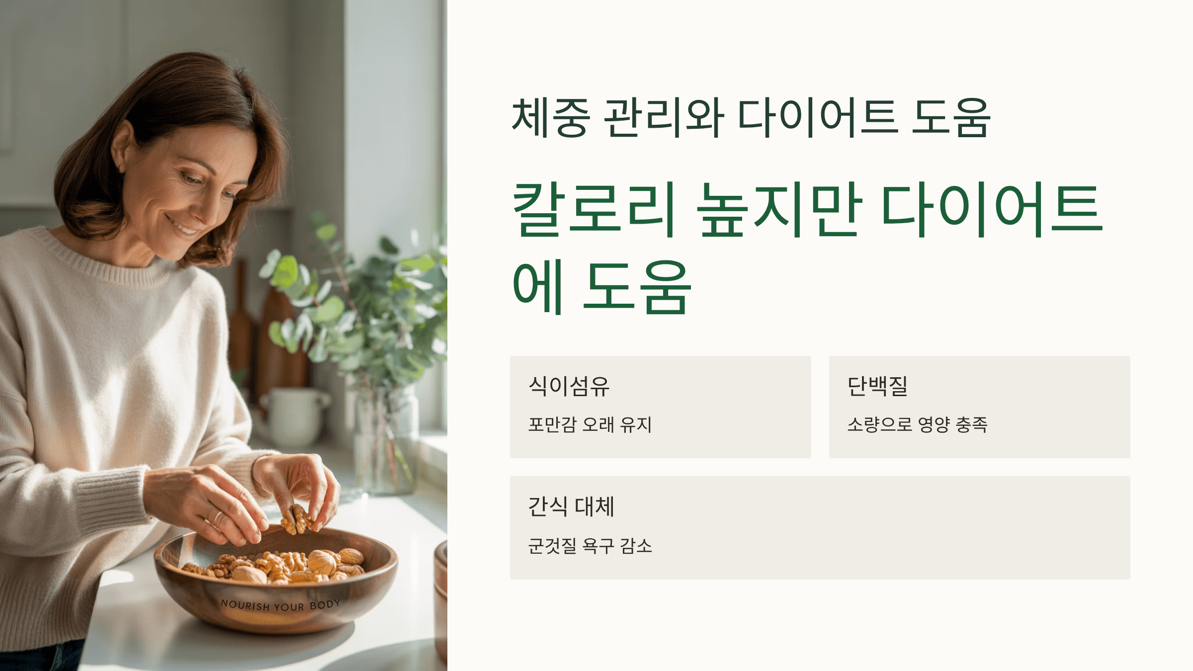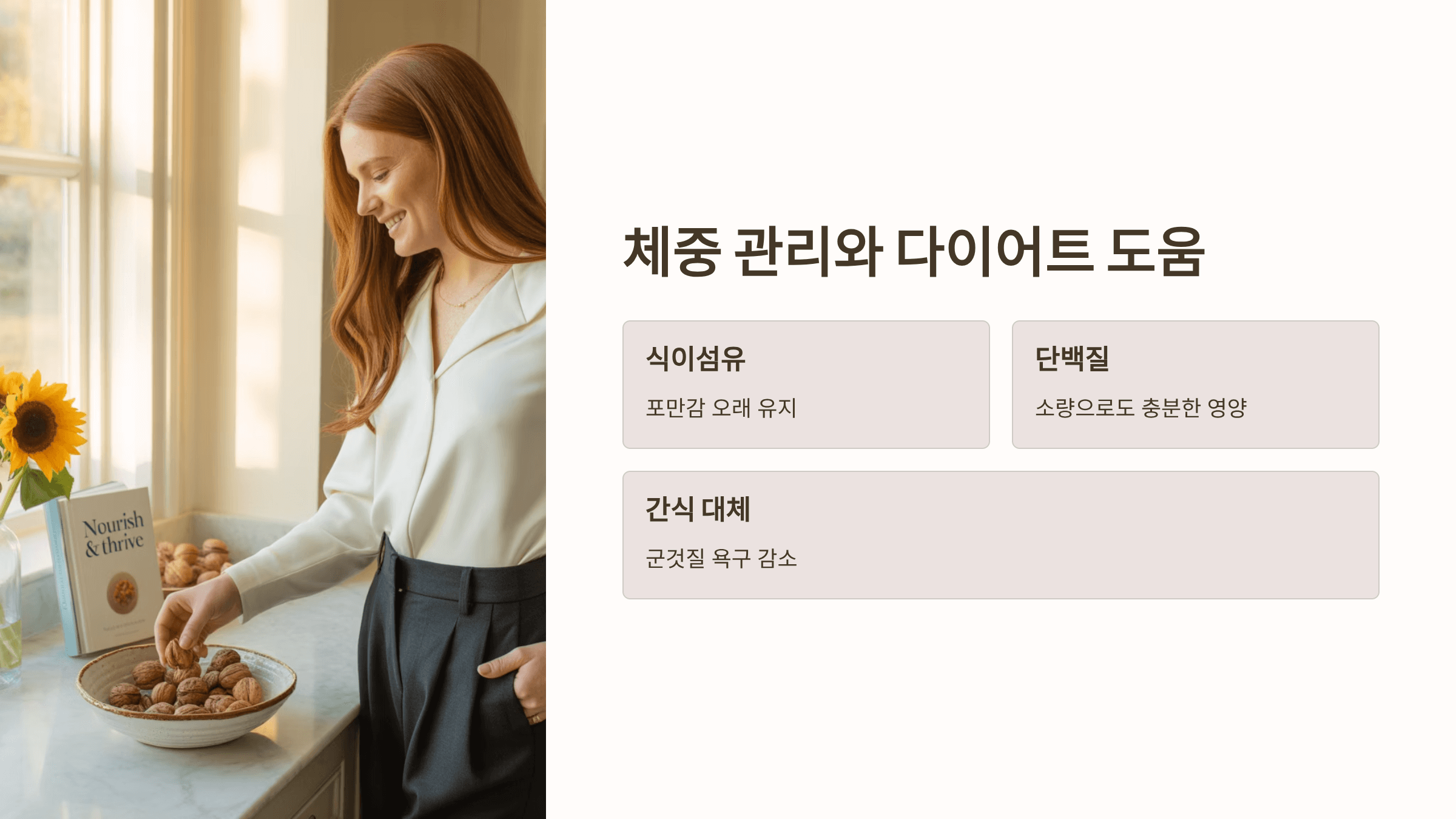 호두는 칼로리가 높은 편이지만, 다이어트에도 의외로 도움이 됩니다. 그 이유는 식이섬유와 단백질이 풍부해서 소량만 먹어도 포만감을 오래 유지해주기 때문입니다.