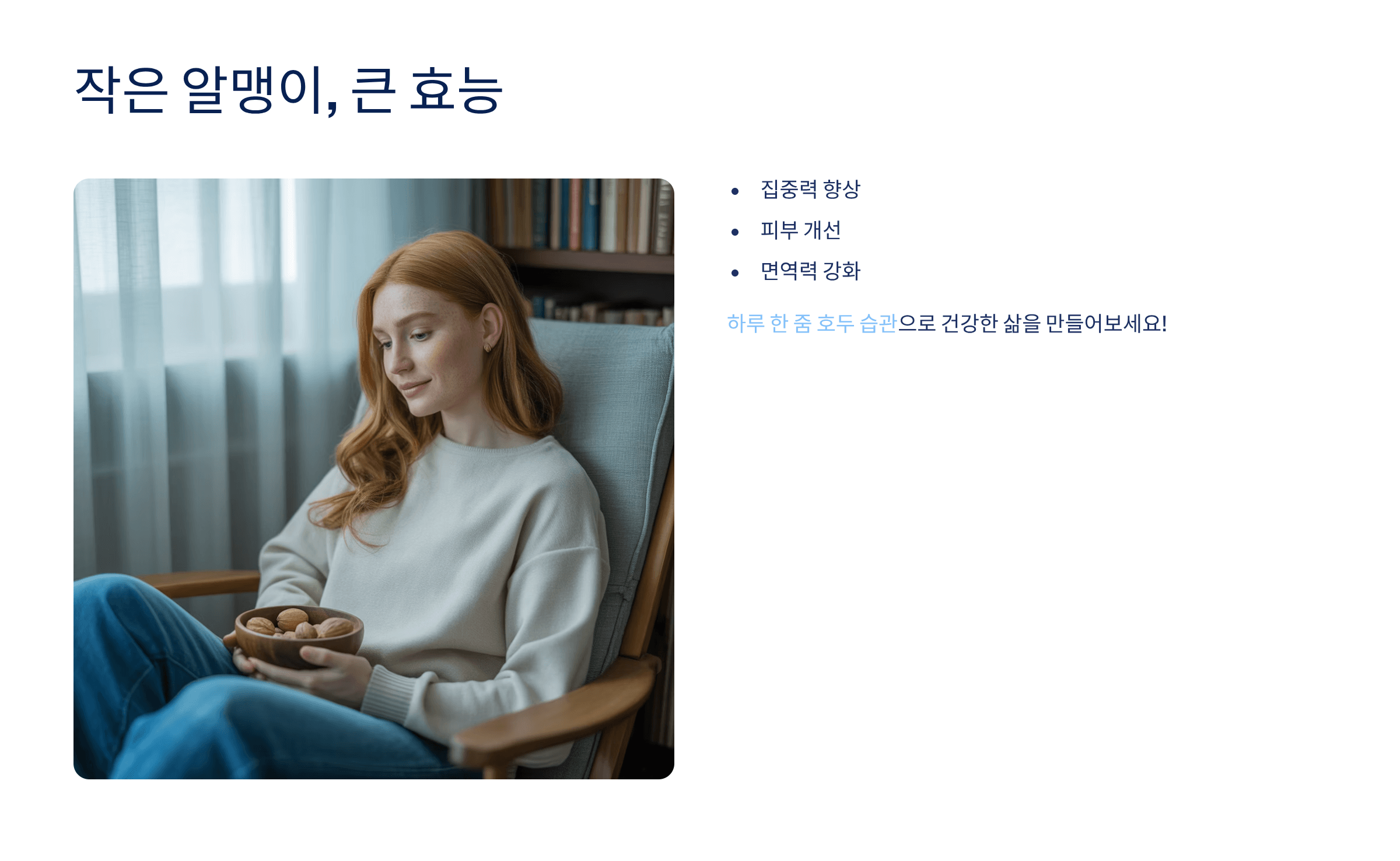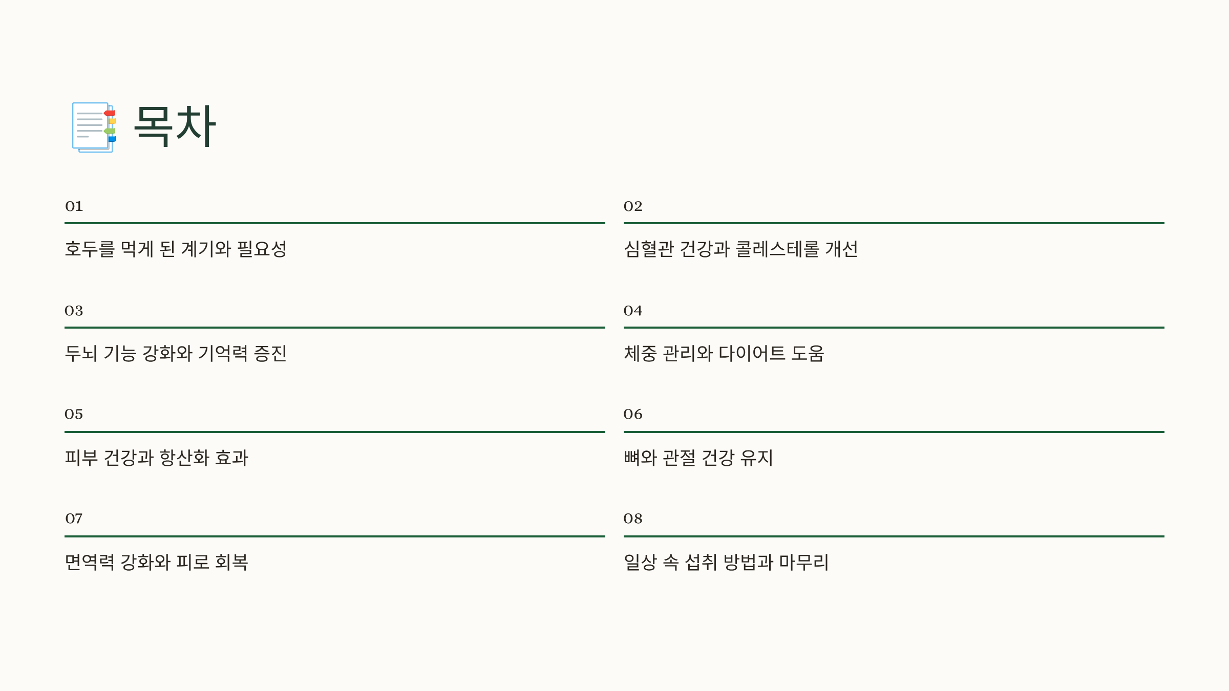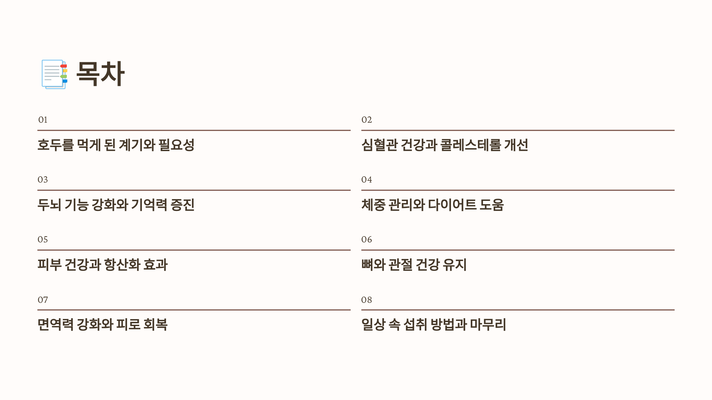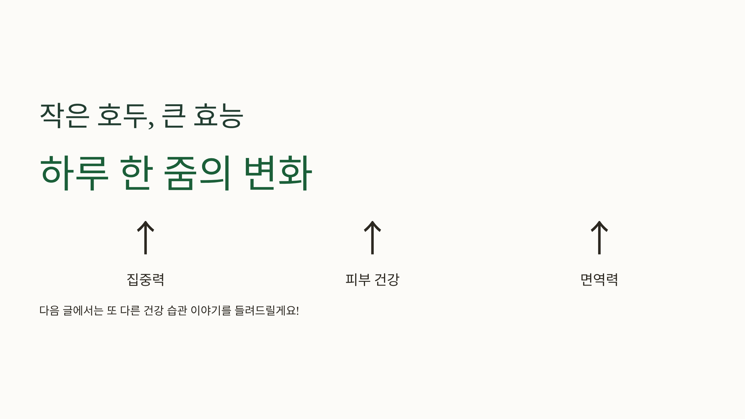 호두는 작은 알맹이지만 그 속에 엄청난 영양과 효능이 담겨 있습니다. 꾸준히 챙기다 보니 집중력도 높아지고, 피부도 좋아지고, 면역력까지 높아지는 걸 몸소 느낄 수 있었어요. 앞으로도 하루 한 줌 호두 습관을 계속 이어가 보려 합니다. 다음 글에서는 또 다른 건강 습관 이야기를 들려드릴게요!