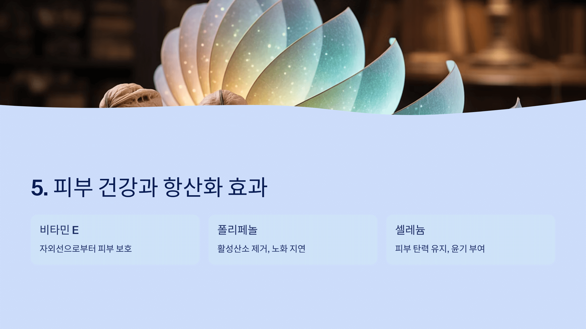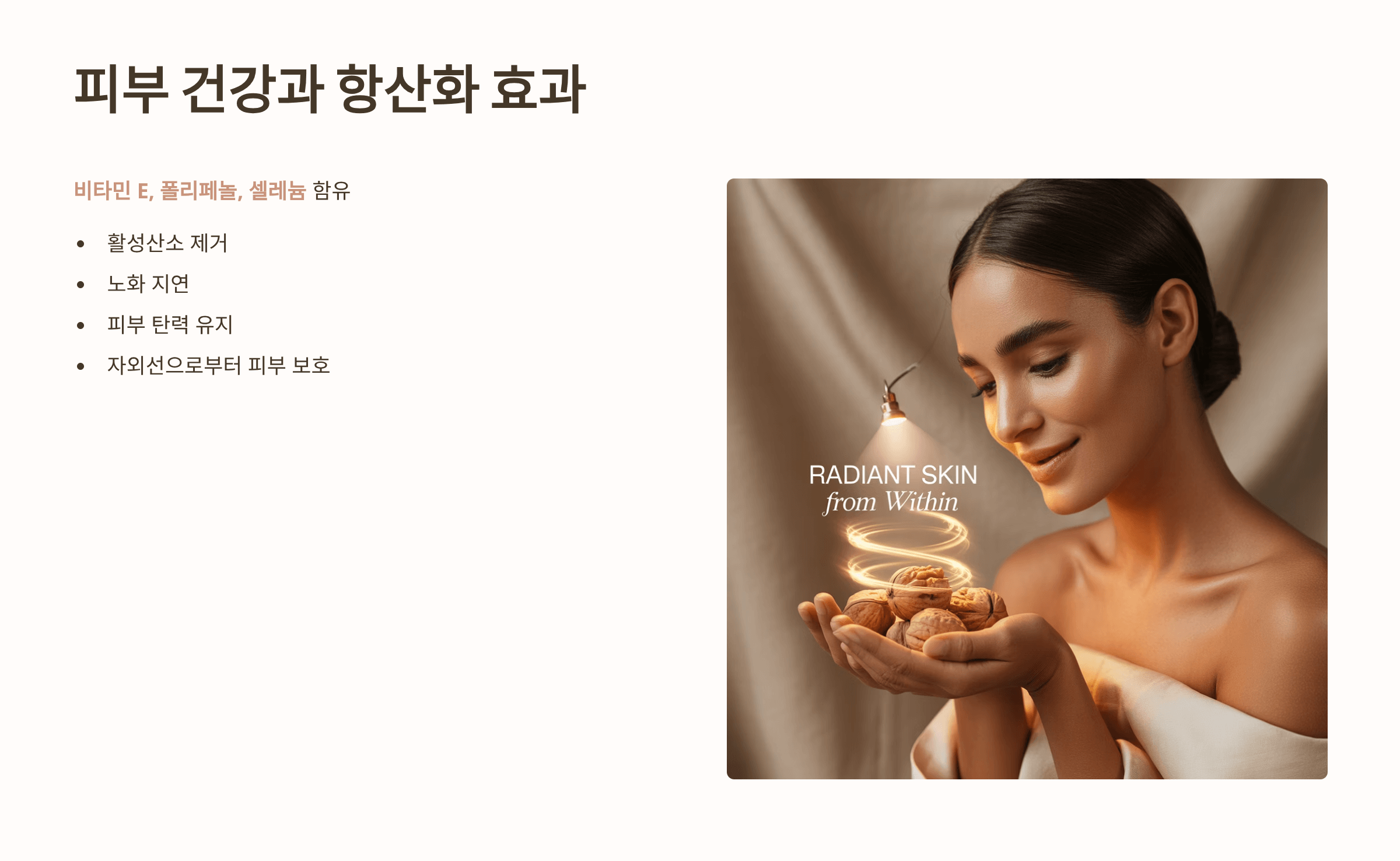 저는 특히 피부가 건조해지고 푸석해질 때 호두를 챙겨 먹으면 확실히 피부 톤이 맑아지고 윤기가 돌았습니다. 또한 비타민 E는 자외선으로부터 피부를 보호하는 데도 도움을 줘서 꾸준히 섭취할수록 피부가 건강해진다는 걸 느꼈습니다.