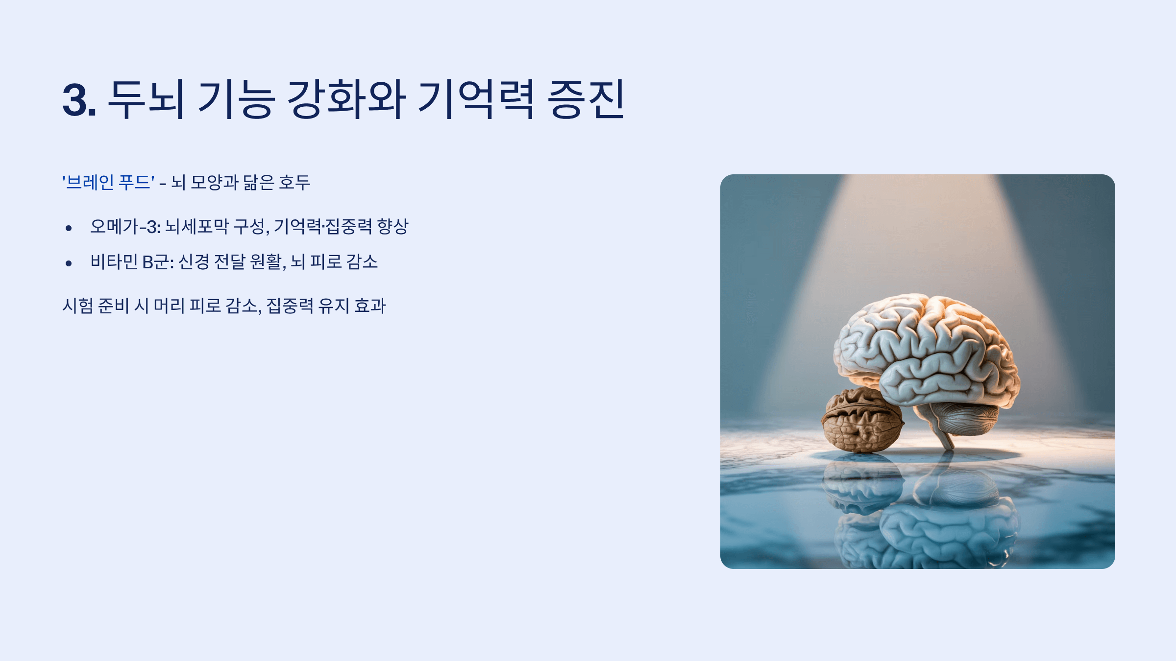 오메가-3 지방산은 뇌세포막을 구성하는 데 중요한 역할을 하고, 기억력과 집중력을 높여줍니다. 또한 비타민 B군은 신경 전달을 원활하게 하여 뇌 피로를 줄여줍니다. 저도 시험 준비할 때 호두를 챙겨 먹었는데, 확실히 머리가 덜 피곤하고 공부 집중력이 유지되는 걸 체감했습니다.