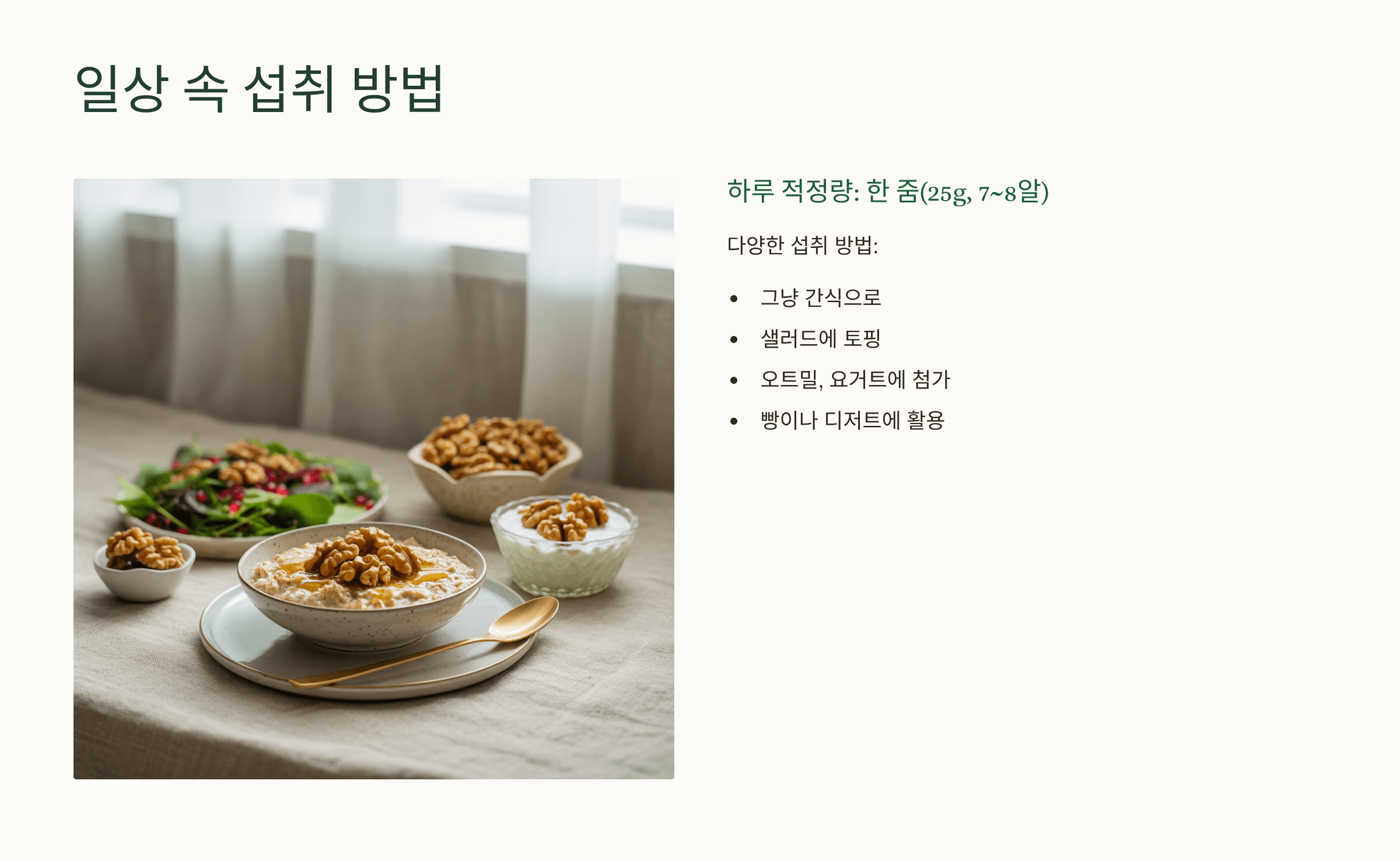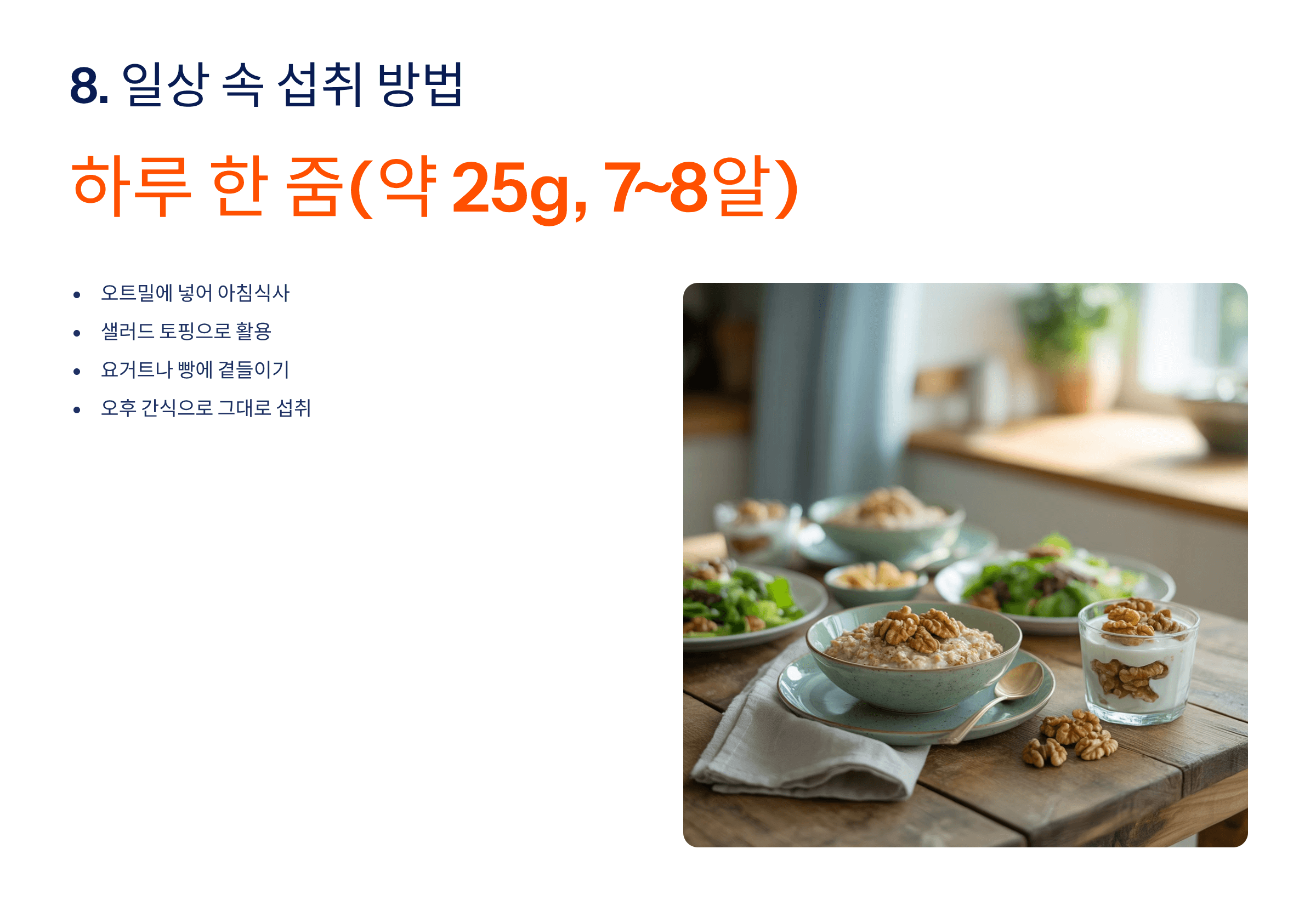 저는 아침에 오트밀에 호두를 넣어 먹거나, 오후에 당이 떨어질 때 호두를 간식으로 챙겨 먹습니다. 단, 너무 많이 먹으면 칼로리가 높아 체중 증가로 이어질 수 있으니 적정량을 지키는 게 중요해요.