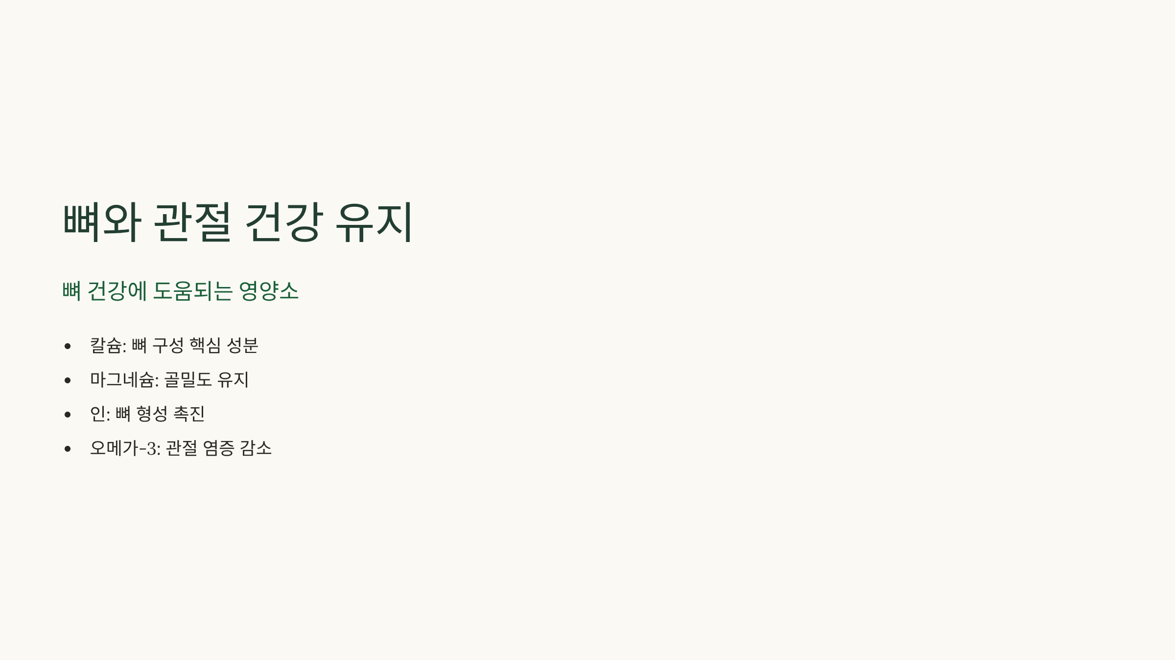 호두에는 칼슘, 마그네슘, 인이 풍부하게 들어 있어 뼈를 튼튼하게 하고 골다공증 예방에 도움을 줍니다. 또한 오메가-3 지방산은 관절 염증을 줄여 관절 건강에도 긍정적인 영향을 미칩니다.