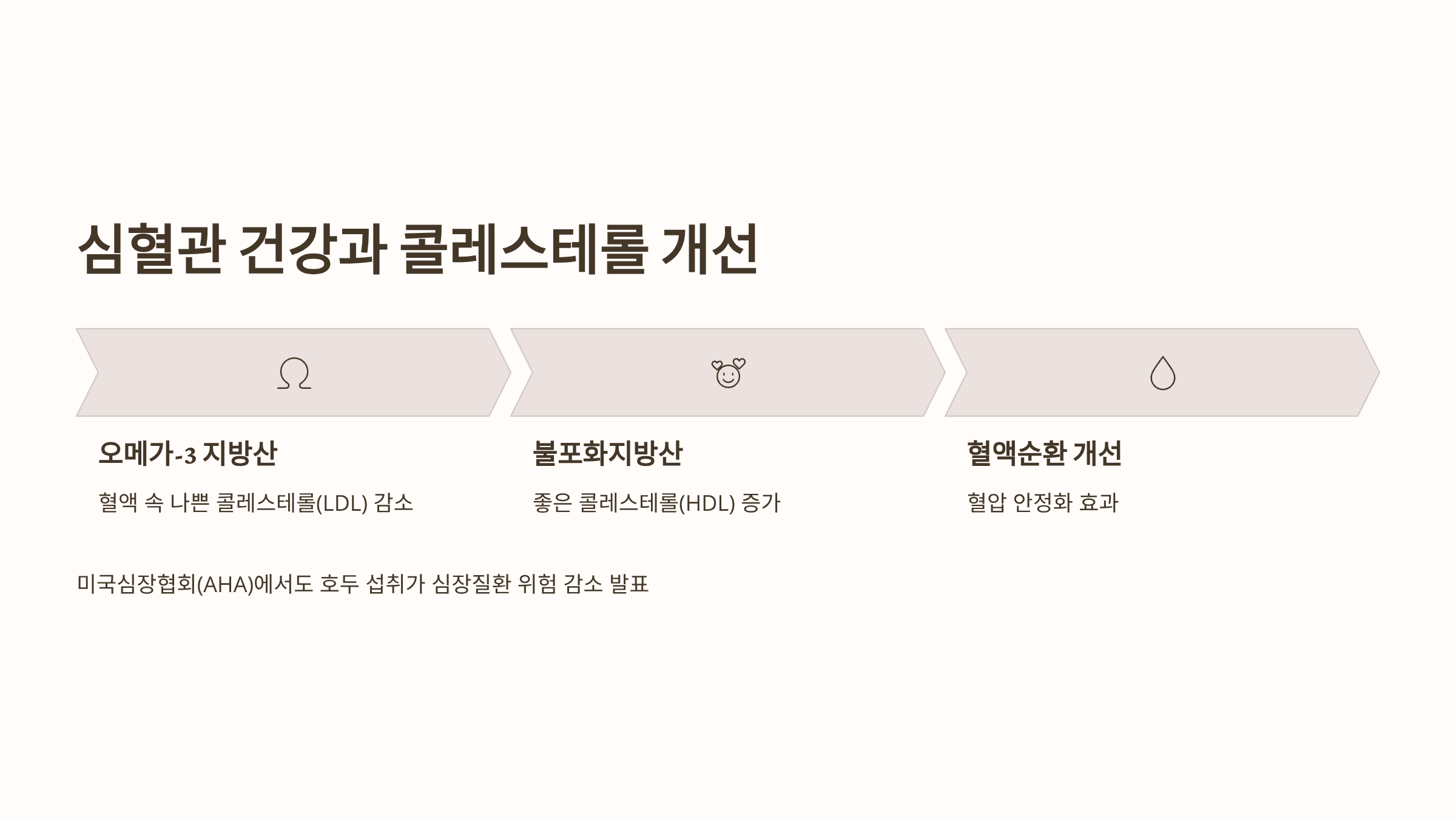 호두 속 오메가-3 지방산과 불포화지방산은 혈액 속 나쁜 콜레스테롤(LDL)을 낮추고, 좋은 콜레스테롤(HDL)을 높여 심혈관 질환을 예방하는 데 효과적입니다. 또한 혈액순환을 원활하게 해 혈압 안정에도 도움을 줍니다.