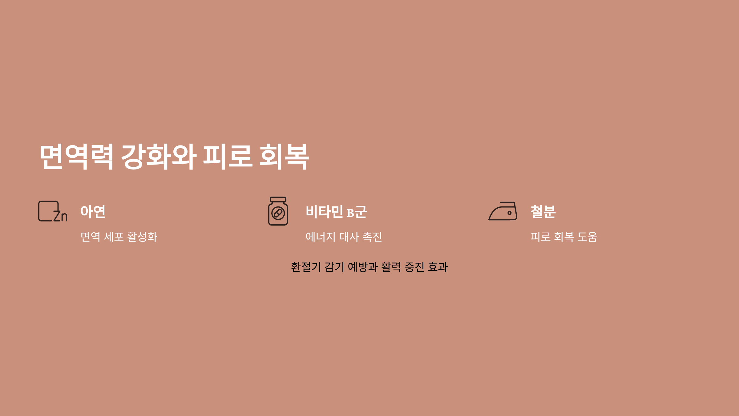 호두 속 아연, 비타민 B군, 철분은 면역 세포를 활성화시켜 감염에 대한 저항력을 높여줍니다. 또한 에너지 대사를 원활하게 해 피로 회복에도 효과적입니다.