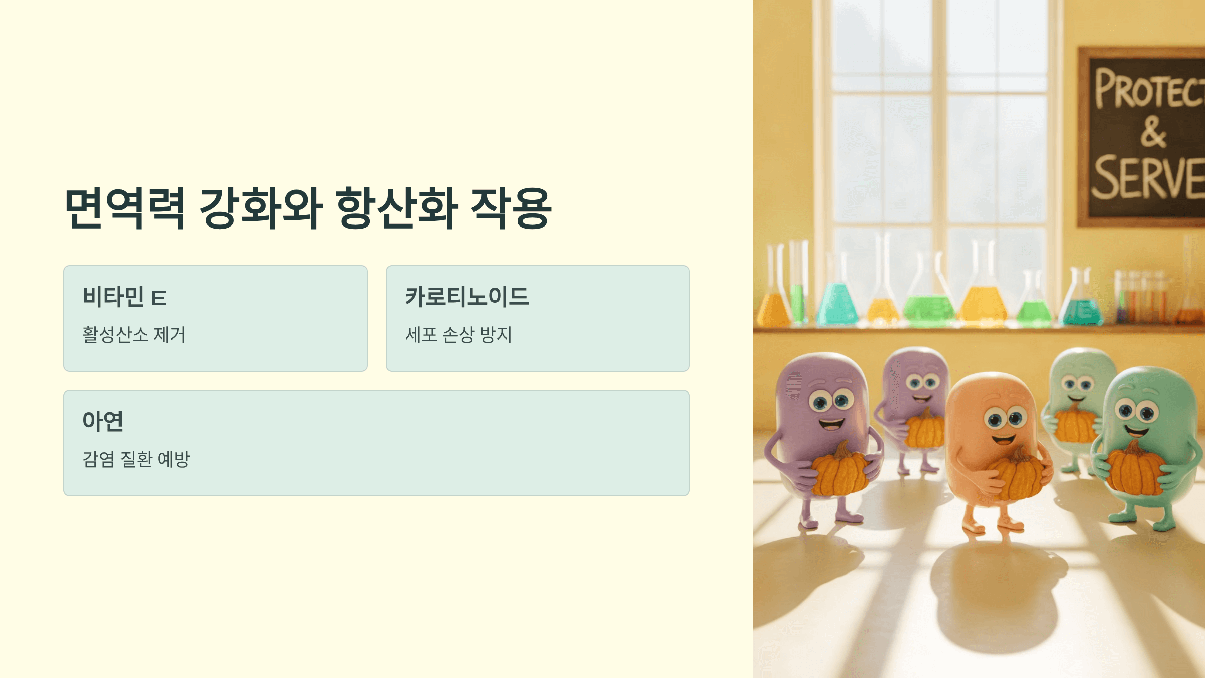 호박씨 속 비타민 E, 카로티노이드, 아연은 면역력 향상에 큰 도움이 됩니다. 활성산소를 제거해 세포 손상을 막아주고, 감기와 같은 감염 질환을 예방하는 효과도 있어요. 저도 환절기만 되면 잔병치레가 많았는데, 호박씨를 꾸준히 먹으면서 확실히 피로감이 줄고 회복력이 좋아졌습니다. 🛡️