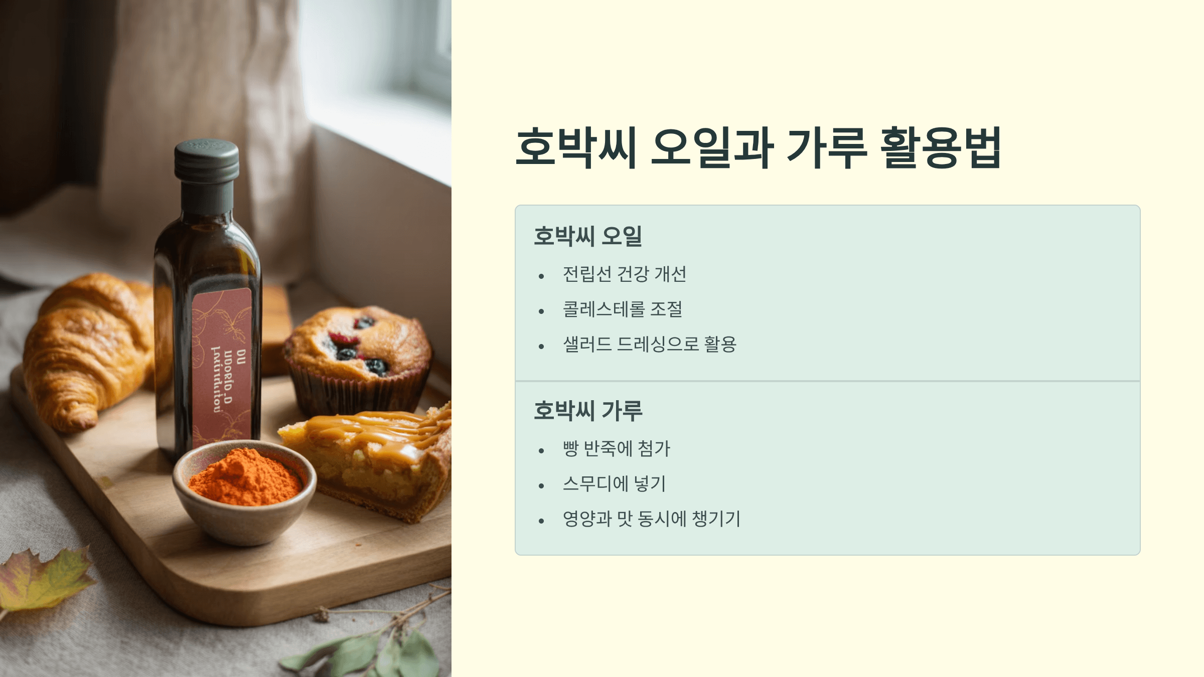 호박씨를 그대로 먹는 것도 좋지만, 오일이나 가루 형태로 활용하면 더 다양한 방식으로 즐길 수 있습니다. 호박씨 오일은 전립선 건강과 콜레스테롤 개선에 효과적이며, 샐러드 드레싱으로 쓰면 고소한 풍미를 더해줍니다. 또 호박씨 가루는 빵이나 스무디에 넣으면 영양과 맛을 동시에 챙길 수 있어요. 저는 주말마다 스무디에 호박씨 가루를 넣어 먹는데, 든든하고 활력이 생깁니다.