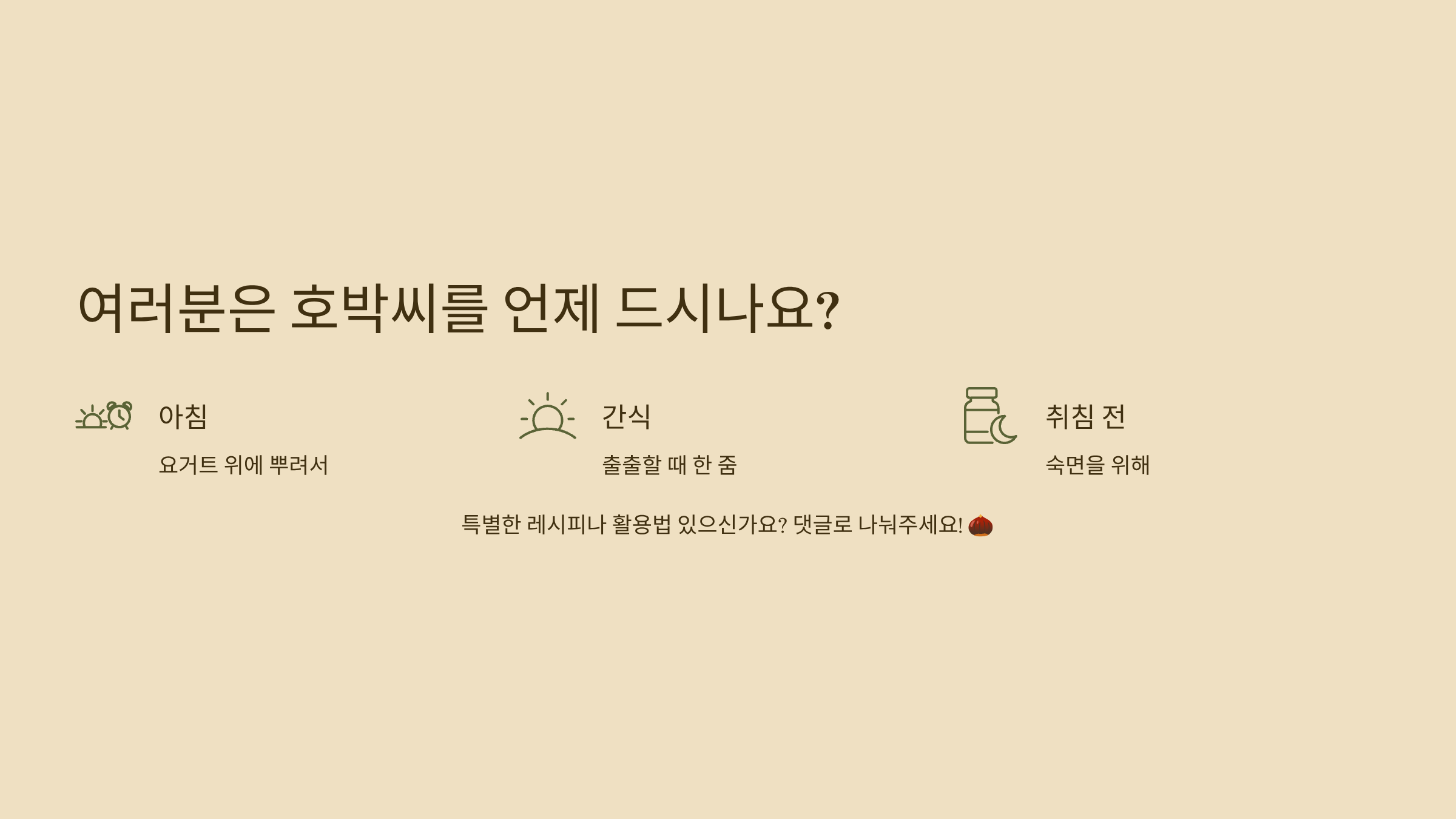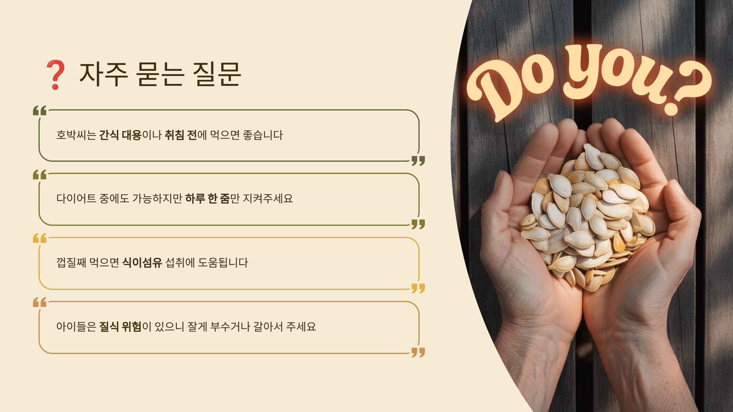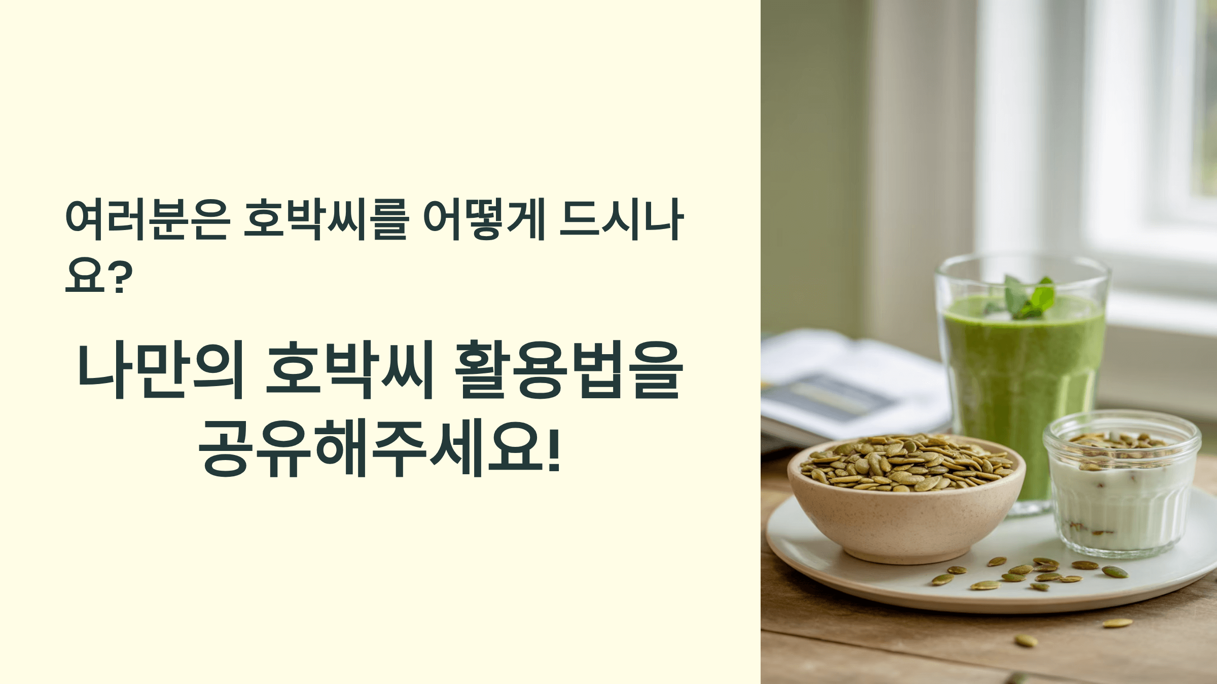 여러분은 호박씨를 언제 드시나요? 저는 아침 요거트 위에 뿌리거나, 저녁 자기 전에 한 줌 먹는 걸 즐기고 있어요. 혹시 특별한 레시피나 활용법 있으신가요? 댓글로 나눠주시면 저도 따라 해보고 싶습니다. 🌰