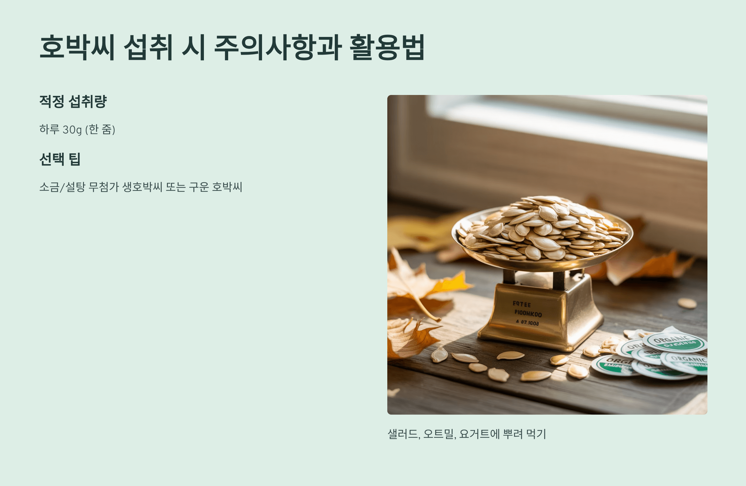 호박씨는 하루 30g, 즉 한 줌 정도가 적당합니다. 많이 먹으면 칼로리 과잉이 될 수 있고, 드물게 소화불량을 일으킬 수도 있어요. 소금이나 설탕이 첨가되지 않은 생 호박씨나 구운 호박씨를 선택하는 게 가장 좋습니다. 저는 샐러드, 오트밀, 요거트에 뿌려 먹는데 훨씬 맛있고 건강하게 즐길 수 있어요. 🍽️