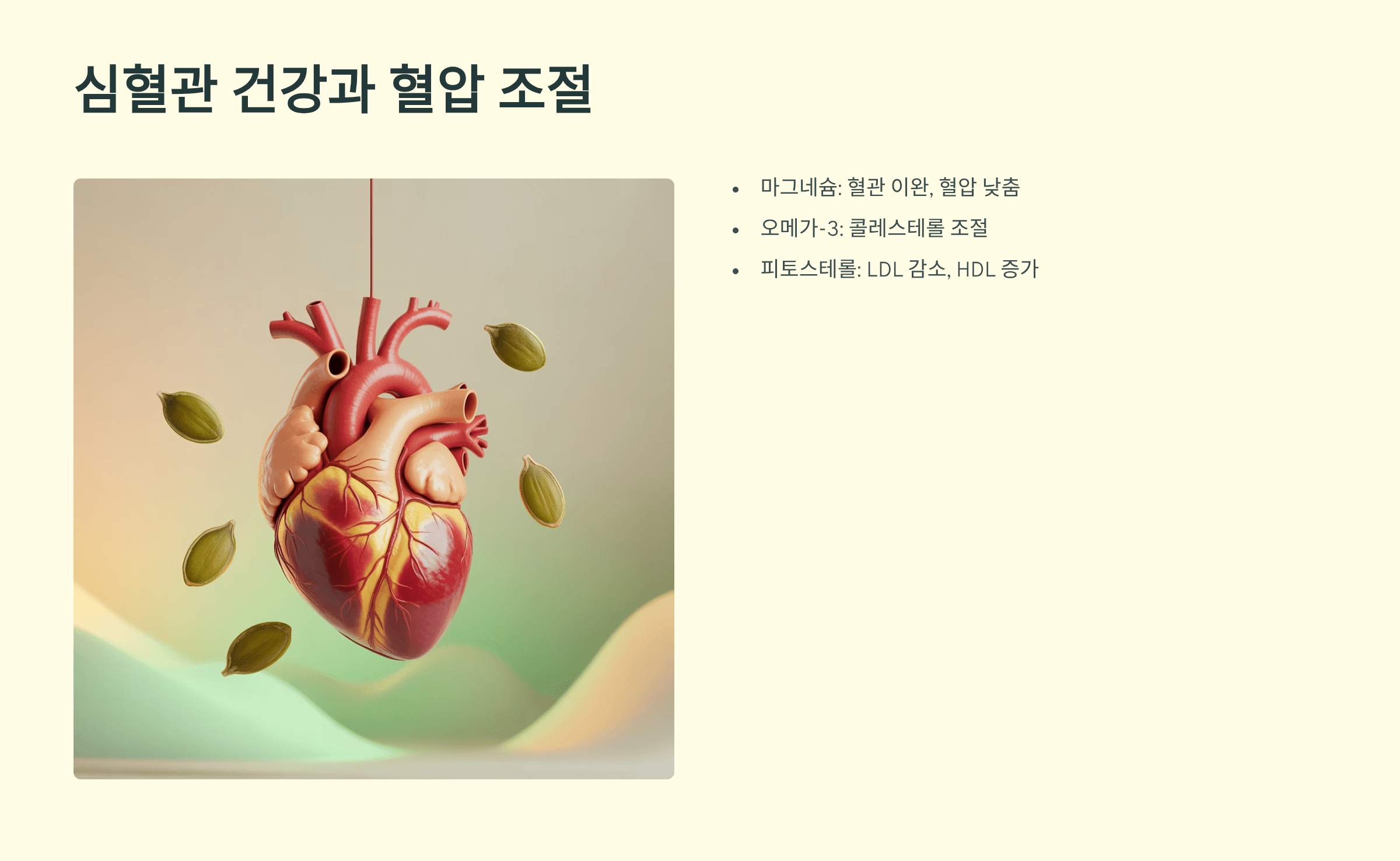 호박씨는 혈관 건강에도 탁월합니다. 마그네슘은 혈관을 이완시켜 혈압을 낮추고, 오메가-3 지방산은 혈액 속 콜레스테롤을 조절해 동맥경화를 예방해 줍니다. 또 피토스테롤 성분은 나쁜 콜레스테롤(LDL)을 줄이고, 좋은 콜레스테롤(HDL)을 늘려주죠. 저는 기름진 음식을 먹고 나서 호박씨를 챙기면 속이 편안하고 몸이 한결 가벼워지는 걸 느낍니다. 🫀